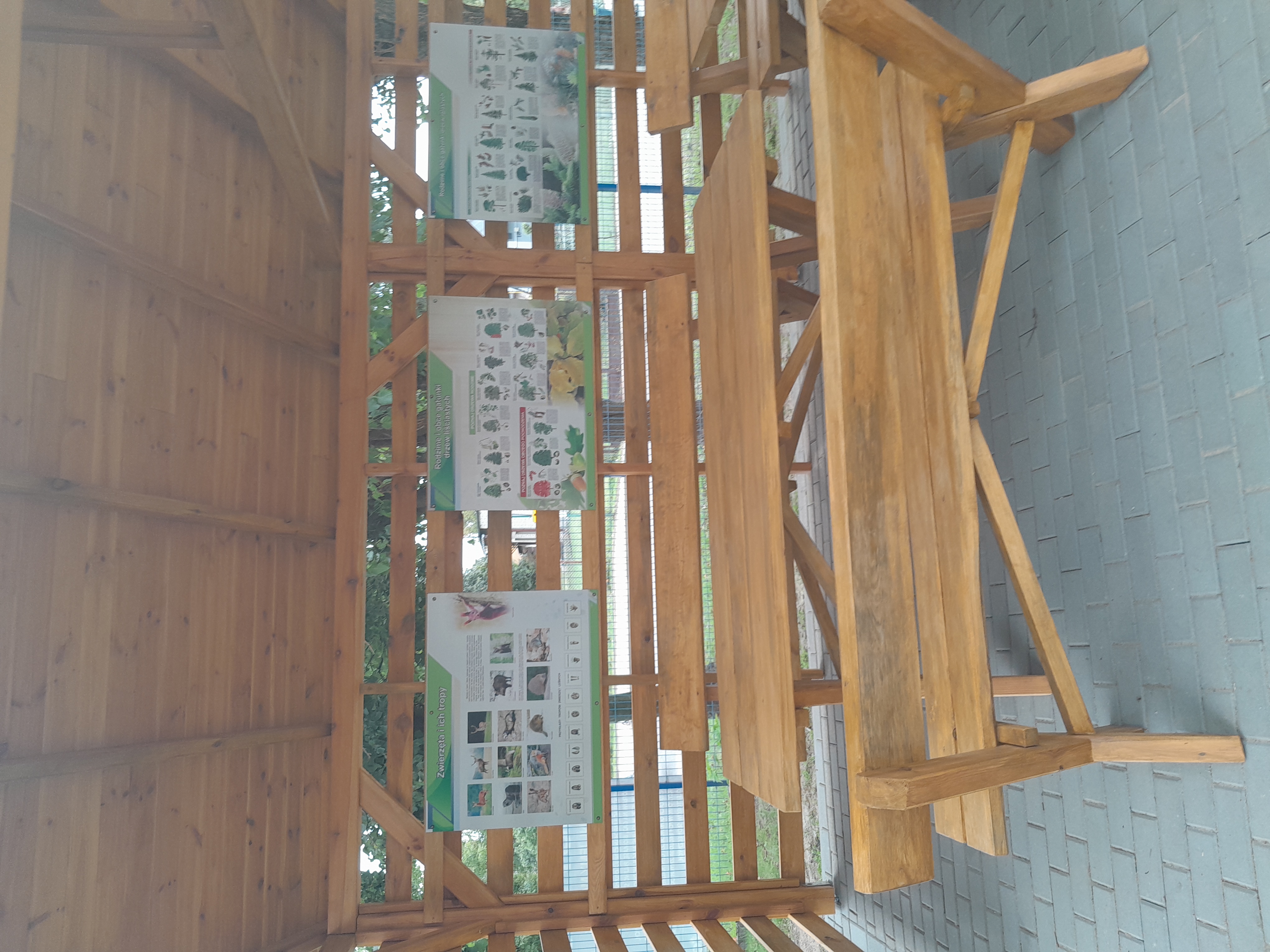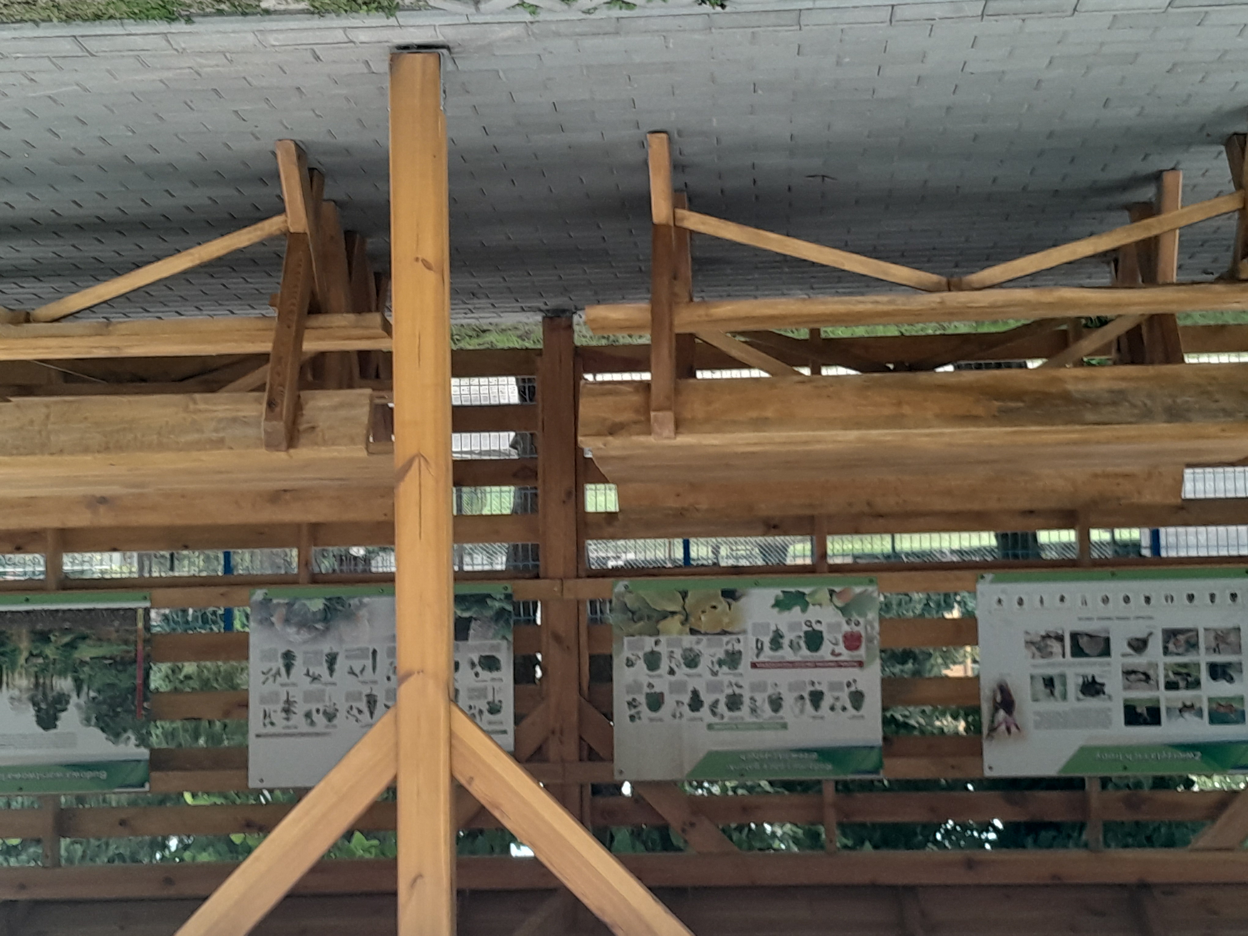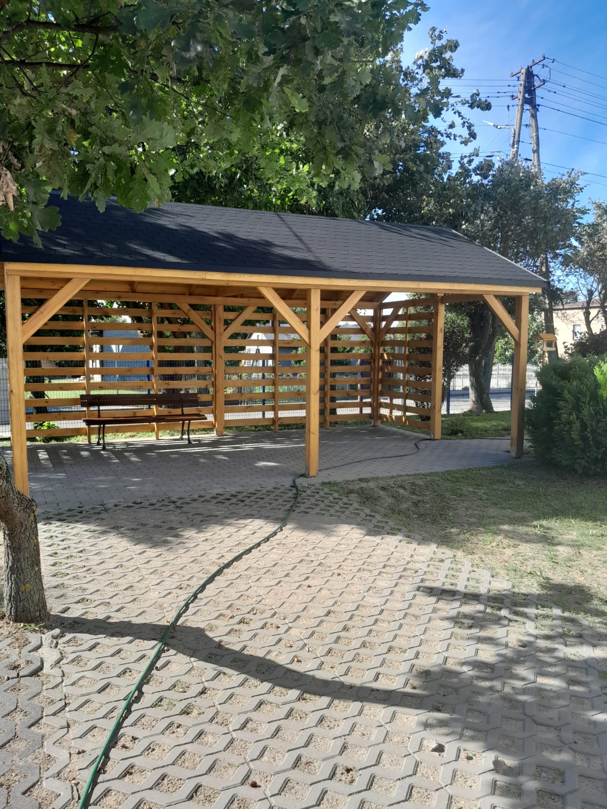 Przestronną altanę dydaktyczną wraz dwoma stołami i ławami;