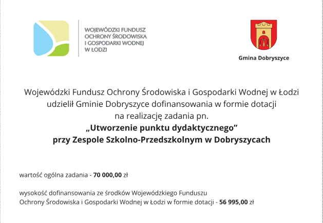 Na realizacje zadania Gmina Dobryszyce uzyskała dofinansowanie z Wojewódzkiego Funduszu Ochrony Środowiska i Gospodarki Wodnej w Łodzi w kwocie 56.995,00 zł
